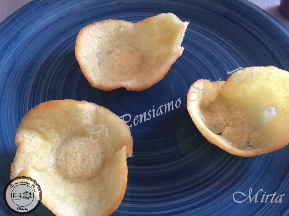 Appena tolti appoggiare la cialda sopra la base di una tazzina o dentro un pirottino, la sostanza è farle prendere la forma di coppetta.Far ascigare bene.