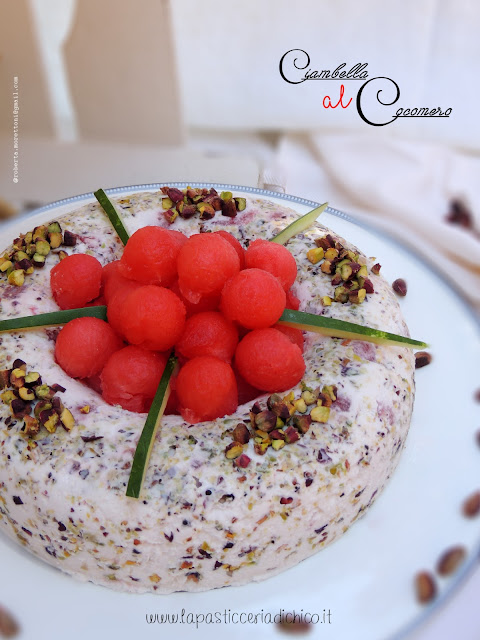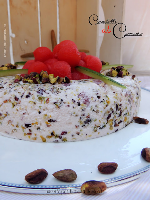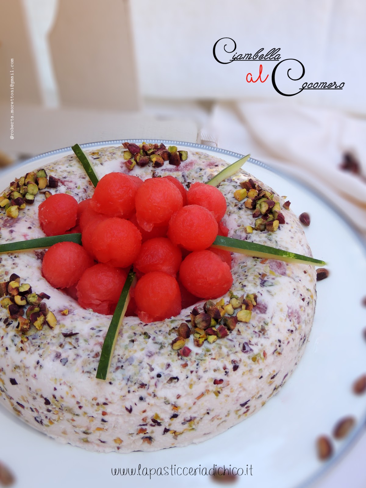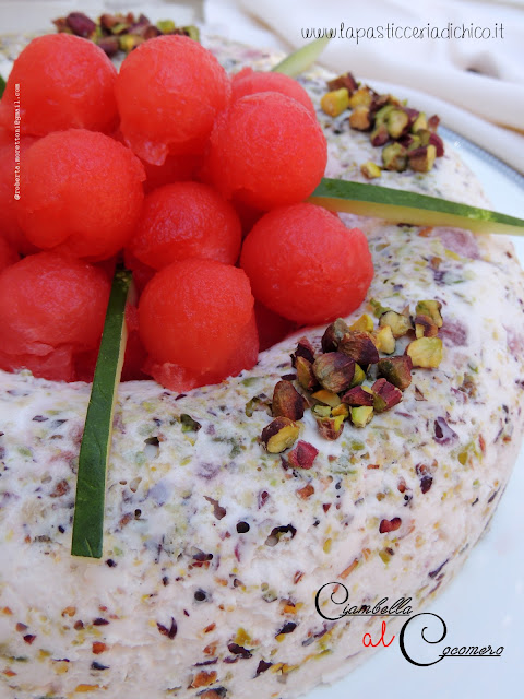 - Quando il dolce è abbastanza duro, io lo tenuto in freezer per 2h, toglietelo dallo stampo, nel caso usiate uno stampo in metallo, mettete lo stampo a bagno in acqua calda per un momento. Appoggiate il dolce sul piatto da portata,quindi mettete nel foro centrale le paline di cocomero, dopo di che ultimate la decorazione con la scorza del cocomero e con la granella di pistacchio. Servite il dolce ad una temperatura di +4°.