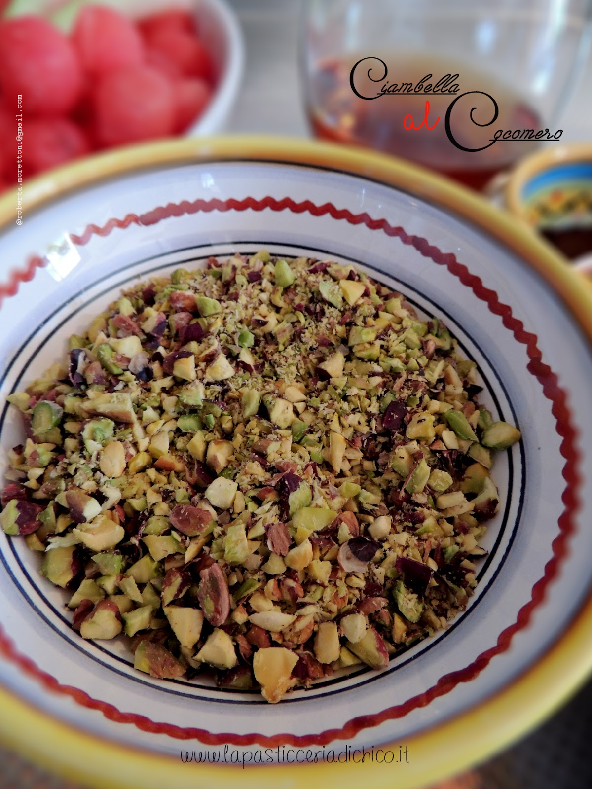 Oltre al cocomero, in questo dolce c’è un’altro ingrediente che ne caratterizza il gusto, il Vin Santo. Ho deciso di usare questo vino, perchè secondo me crea un buon abbinamento con il cocomero e i pistacchi, naturalmente, visto che si parla di gusti personali, questo può essere sostituito con altri vini liquorosi, oppure con altri liquori o distillati, che siano però a basso contenuto alcolico, questa scelta è molto importante per la buona riuscita del dolce, come è molto importante, anzi fondamentale utilizzare un cocomero al giusto punto di maturazione.