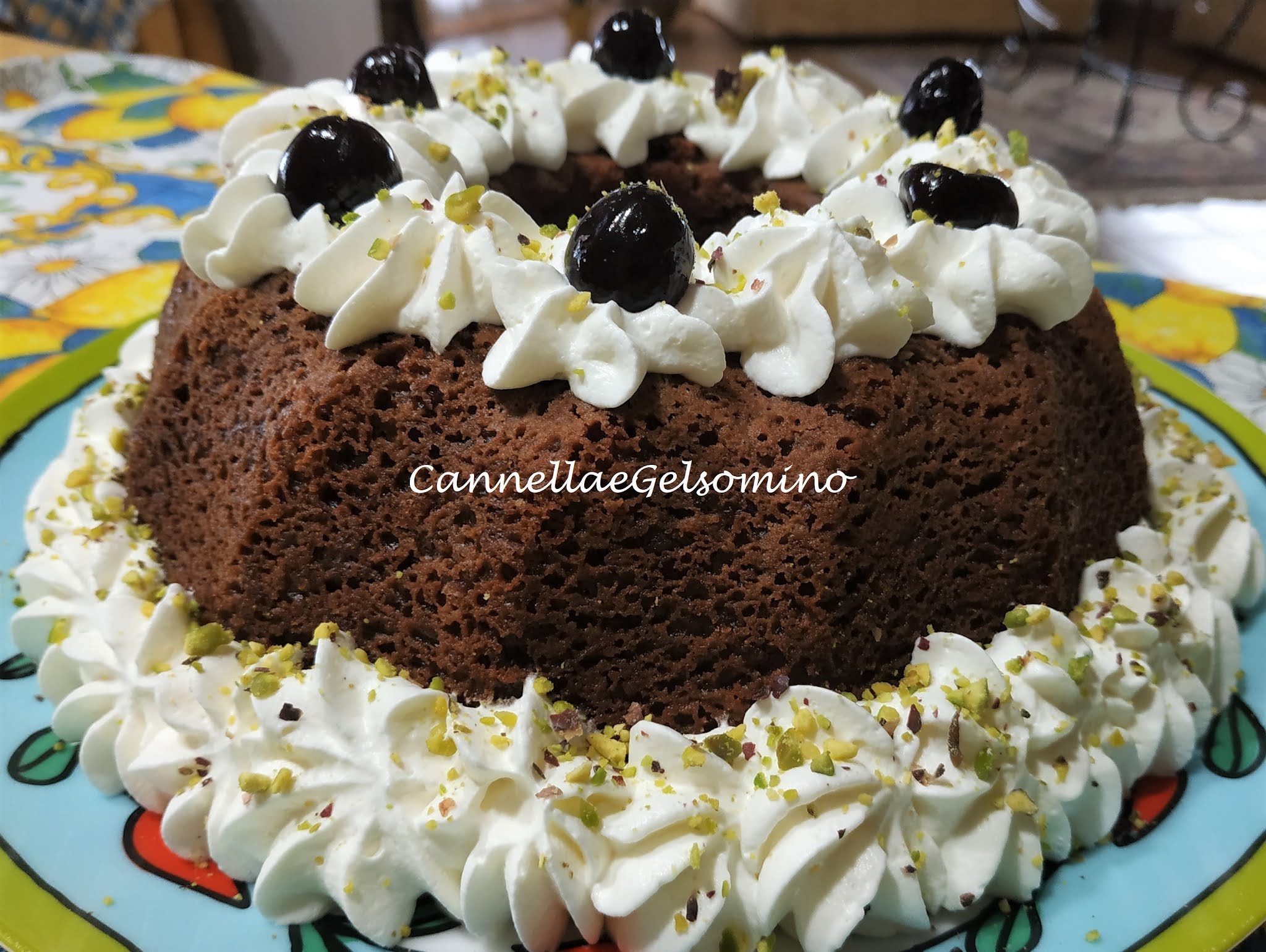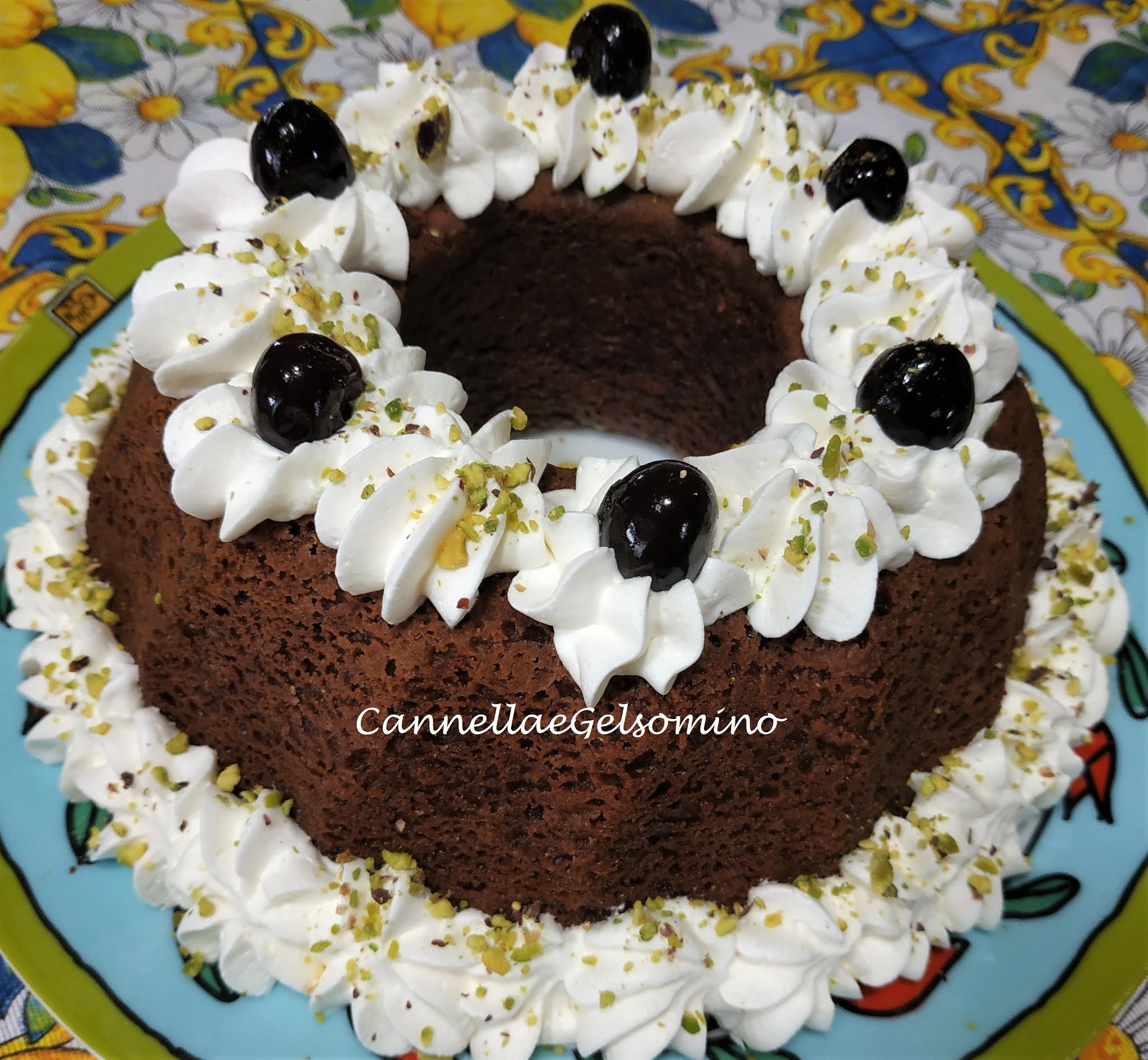 Ho inzuppato la ciambella e ho continuato a decorarla con panna montata, granella di pistacchi e amarene. Che dirvi? E’ favolosa!