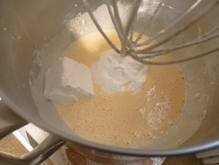 In una ciotola della planetaria con il gancio a gomitolo, montare le uova con lo zucchero fino a ottenere un composto chiaro e spumoso.