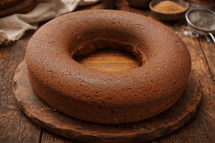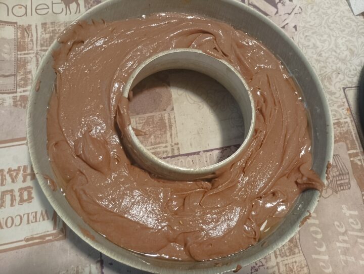 Versare l’impasto in uno stampo da ciambella imburrato e infarinato. Cuocere in forno statico preriscaldato a 170°C per circa 45 minuti (prova stecchino).