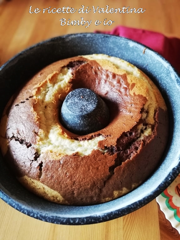 Mettere nel boccale del BIMBY, tutti gli ingredienti e lavorare 1 Minuto Velocità 5, versare metà del composto all’interno di uno stampo a forma di ciambella da 26 cm di diametro precedentemente imburrato e infarinato, aggiungere 2 cucchiai di cacao e 2 cucchiai di latte al composto rimasto nel boccale e lavorare 25 Sec. Vel. 5, distribuire il composto a cacao uniformemente nello stampo sopra al composto bianco e cuocere la ciambella in forno già caldo a 180° per circa 40 minuti, facendo sempre la prova stecchino per verificare la cottura interna del dolce che dovrà presentarsi asciutto, eventualmente cuocere ancora per altri 5-10 minuti fino a quando sarà cotto internamente, quindi, togliere la ciambella dal forno, farla intiepidire un po’, trasferirla in un vassoio, aspettare che si raffreddi e poi servire ! per renderla ancora più golosa, cospargerla con lo zucchero a velo.