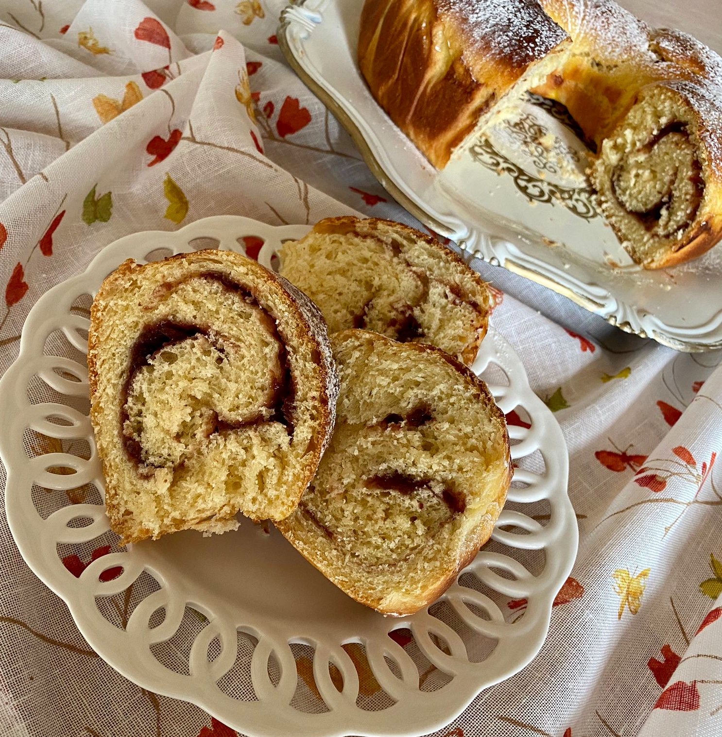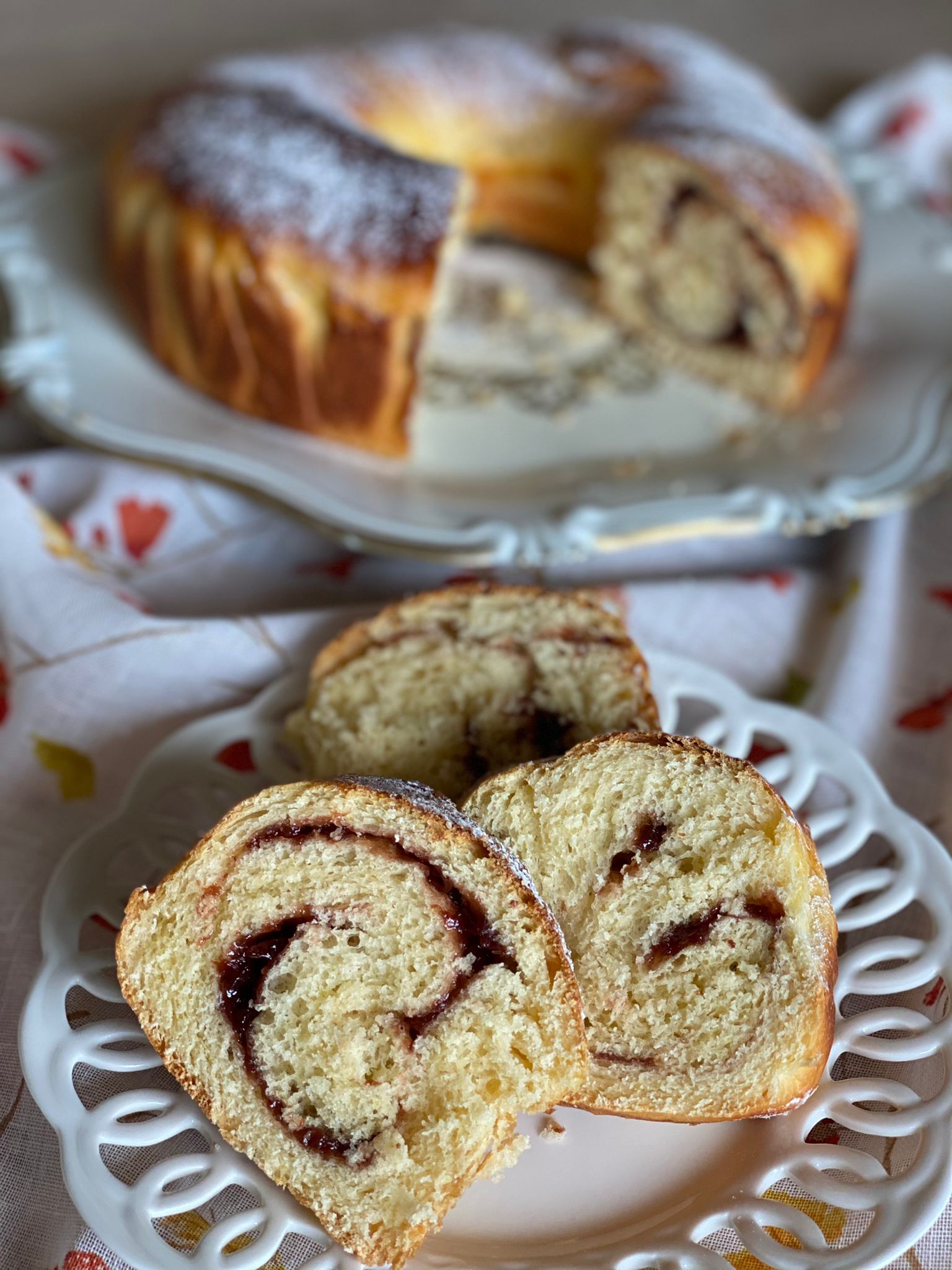 Questa ciambella di pan brioche, la cui ricetta l’ho trovata tempo fa su una rivista di cucina, è così soffice che più soffice non si può. E’ un dolce facile da preparare arricchito con una squisita confettura homemade di ciliegie che mi è stata donata da Rosa, un’amica virtuale che conosco da diversi anni, del blog La cucina di Rosa. Ottimo per iniziare con il piede giusto la giornata, si può trasformare anche in una sostanziosa merenda per i più piccoli….e non solo. Conservatelo in un contenitore a campana e si manterrà soffice e fragrante per più giorni, sempre se….non sparisce prima.