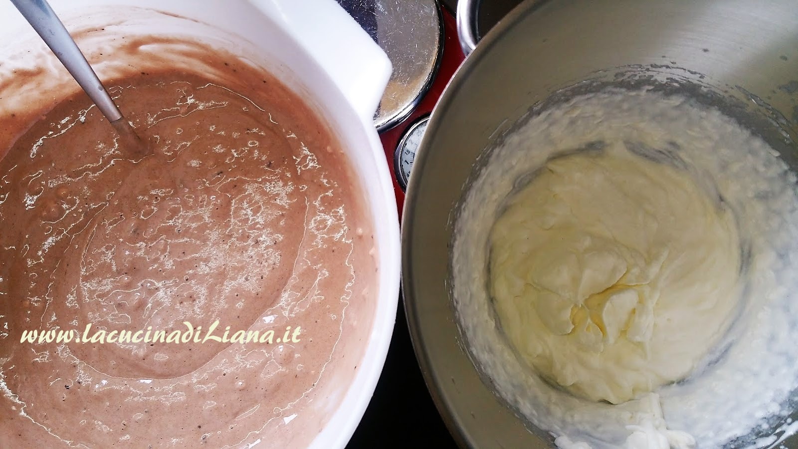 Montare a neve gli albumi, aggiungere lo zucchero, poi la farina, il cacao, il lievito, il latte, amalgamando dall’alto verso il basso. Montare la panna.
