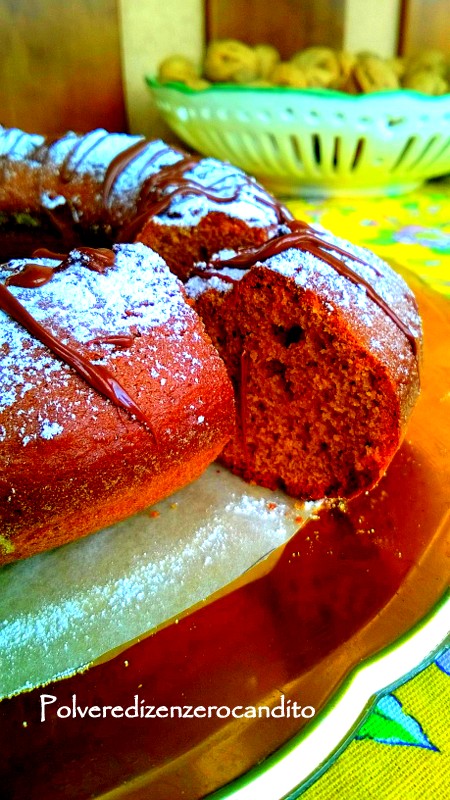 La ciambella di oggi, risulterà morbidissima ed è possibile farcirla a piacere, io l’ho lasciata semplice ma ho messo un bel po’ di zucchero a velo sopra e ho fatto qualche striatura di Nutella per renderla più appetibile.