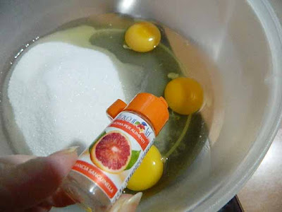In una capiente ciotola montare le uova con lo zucchero e l’Arancia Sanguinella