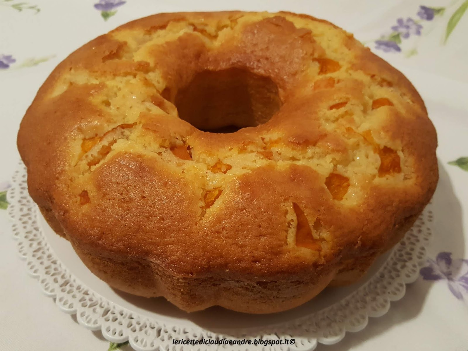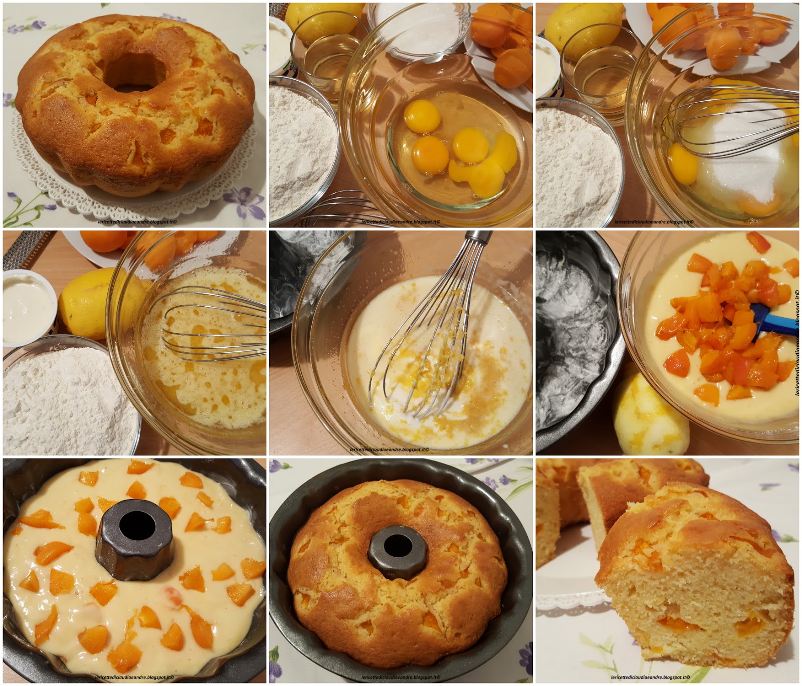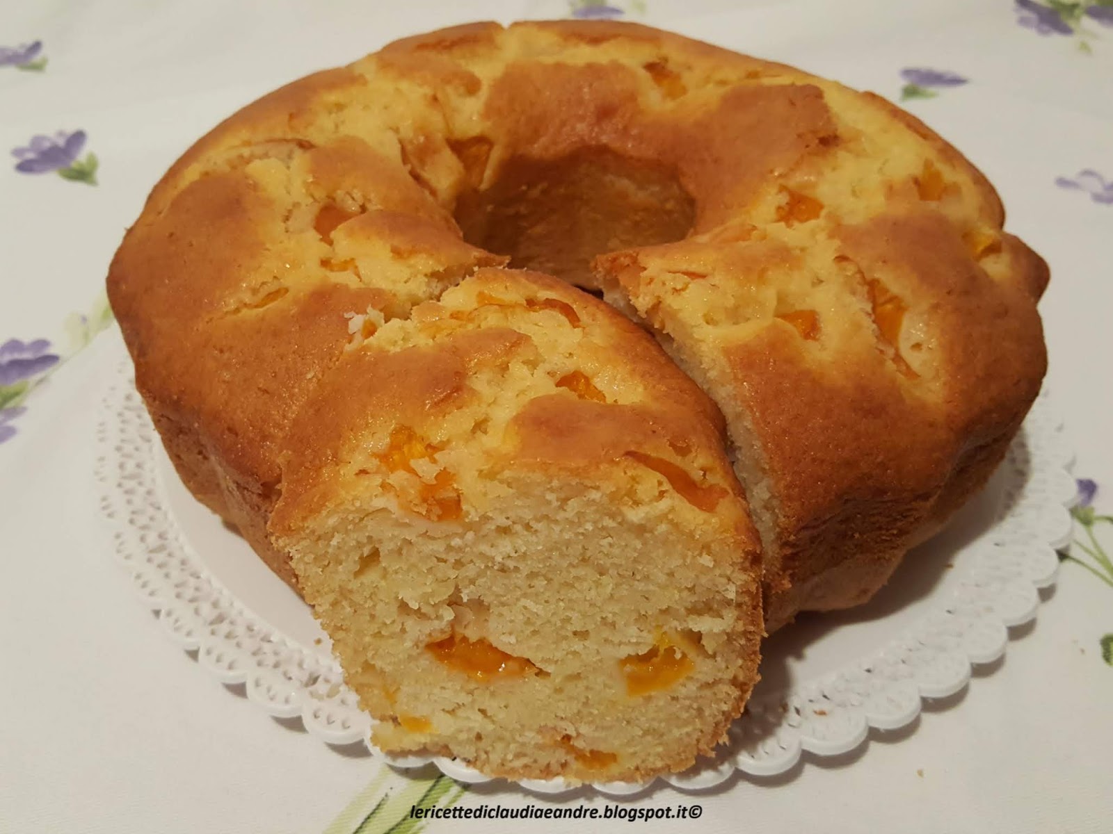 - Versare il composto nello stampo da ciambella o uno stampo a piacere, imburrato ed infarinato in precedenza e distribuire sopra le albicocche rimaste tagliate a cubetti.