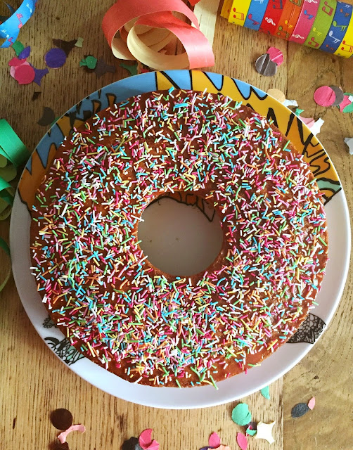 Eccola, una buonissima e sanissima ciambella integrale con sciroppo d’arancia e tanti zuccherini colorati, come fossero tanti coriandoli!
