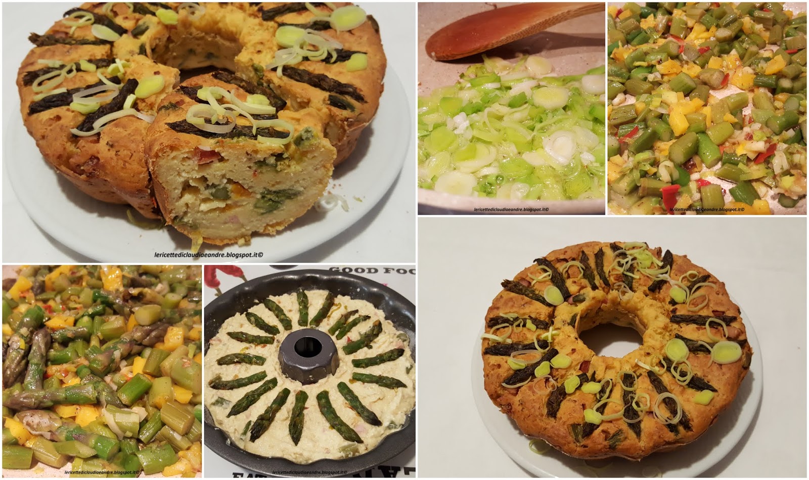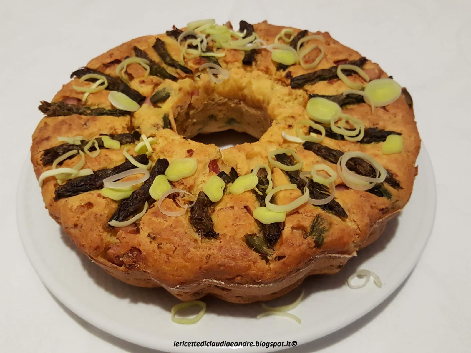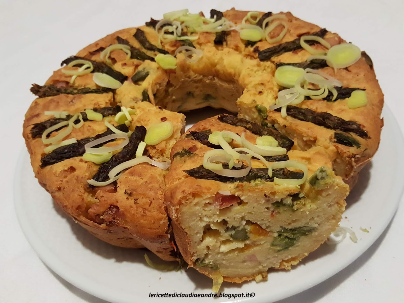 Questa ciambella è nata così, un pò di panna, ricotta fresca che non manca mai, se quella buona, buona, un pezzo di peperone, porro, wurstel viennese, che ultimamente non lo compro molto spesso, ma qualche volta lo prendo per qualche emergenza, il tutto arricchito con degli asparagi surgelati, vuoi che la verdura manchi, che sia mai, un pò di uova e parmigiano, yogurt bianco, latte o acqua, io ho aggiunto un pò di vino bianco al posto di una o altra e voilà, la ciambella è stata pronta per essere assaporata di gusto.