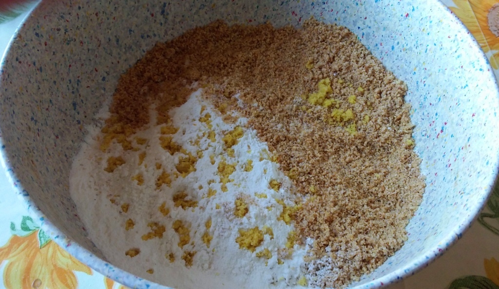 - Miscelare la polvere di nocciole con la restante farina, la fecola e il lievito setacciati insieme. Inserire anche la scorza di limone grattugiata.