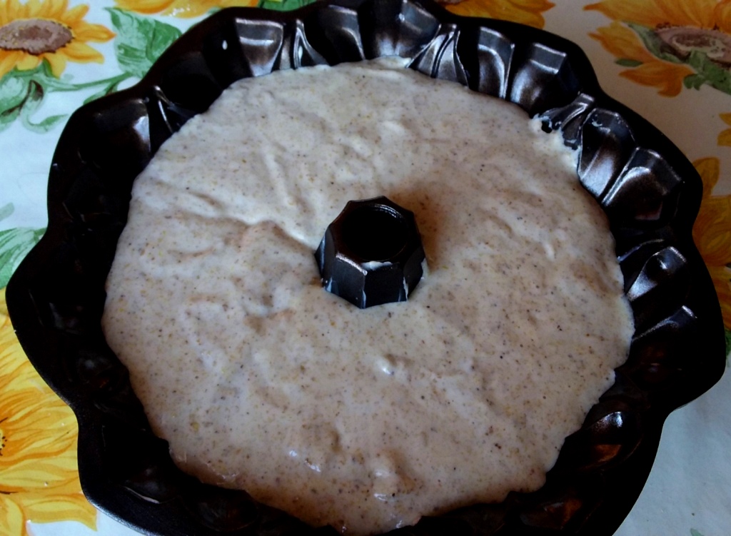 - Quando il tutto risulta ben amalgamato, versarlo in uno stampo da ciambella imburrato e infarinato.