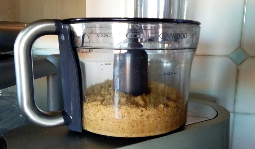- Tritare tutte le nocciole (tostate e non) in un mixer, insieme a metà dello zucchero e a due cucchiai di farina, fino a ridurle in polvere.