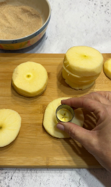 Per prima cosa, prendi le mele, sbucciale e tagliale a fette di circa un centimetro di spessore. Aiutandoti con un coppa pasta rotondo, eliminate il torsolo centrale, in modo da ottenere delle ciambelle perfette.