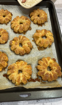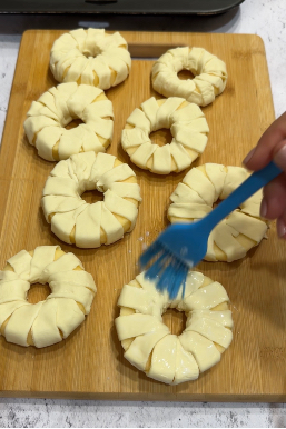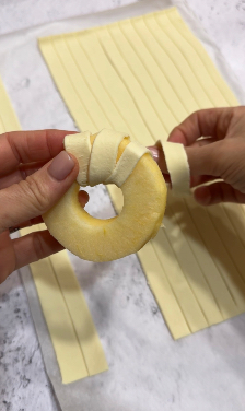 Con delicatezza, avvolgete ogni fetta di mela con due strisce di sfoglia, facendo attenzione a coprire bene i bordi. Questo passaggio richiede cura e pazienza, perché l’aspetto finale delle ciambelle dipende dalla precisione dell’arrotolamento. Il risultato saranno delle ciambelle perfettamente modellate, pronte per essere decorate.