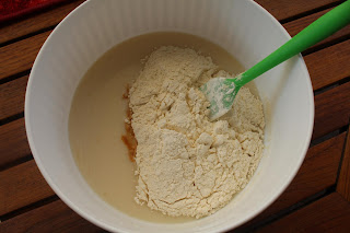 Trascorso il tempo, aggiungere l’estratto di vaniglia, unire le farine e versarle nel composto.