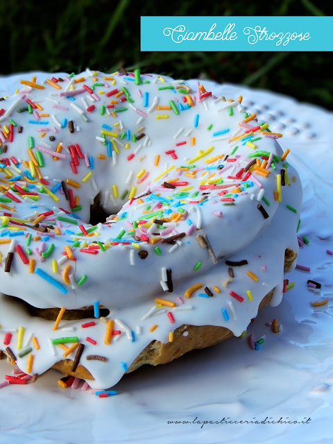 - Dopo circa 35 minuti le ciambelle saranno cotte, lasciate raffreddarle un attimo quindi spennellatele con abbondante ghiaccia reale e cospargete con le codette di zucchero, una volta che la ghiaccia si sarà asciugata le Ciambelle Strozzose cono pronte.