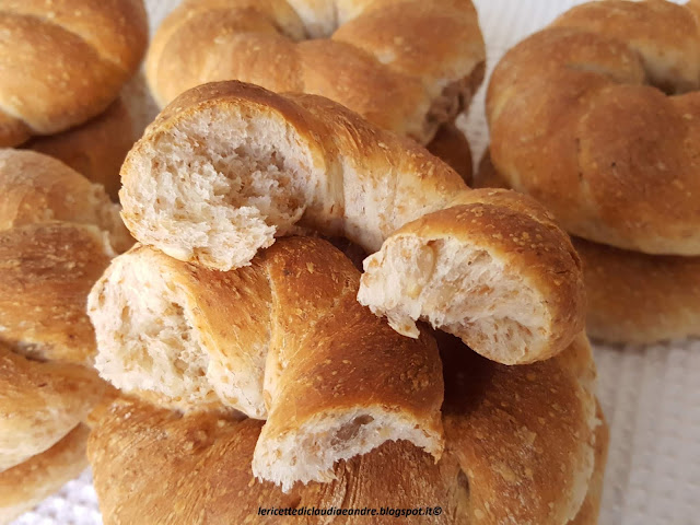 - Preriscaldare il forno a 250°, mettere sotto nel forno una ciotola con dell’acqua per favorire l’umidità nel modo da ottenere delle ciambelline croccante fuori e morbide dentro, infornare e cuoere per circa 20 minuti o fino alla doratura.