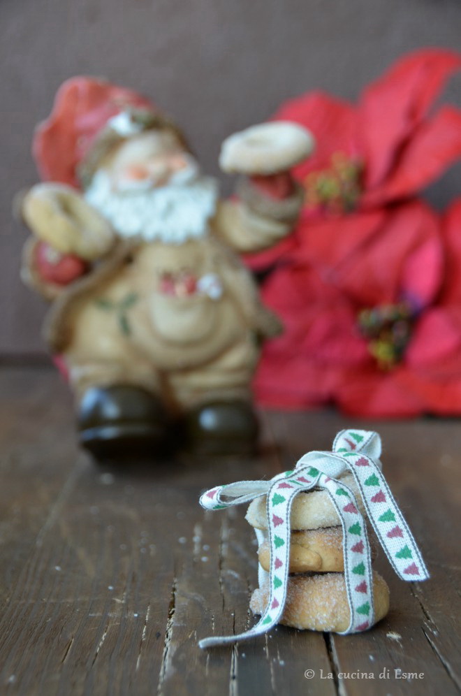 In una grande ciotola versare lo zucchero, la cannella, il vino e l’olio, mescolare bene con una frusta a mano. Iniziate ad aggiungere la farina setacciata, sempre mescolando, verso la fine aggiungete un cucchiaino di lievito. Ad un certo punto non riuscirete più ad andare avanti con la frusta, sarà allora arrivato il momento di iniziare ad impastare a mano, seguitate ad aggiungere la farina. Dovrete ottenere una consistenza tipo quella degli gnocchi. Quando l’impasto sarà pronto, staccatene dei piccoli pezzetti e formate dei cordoncini corti che poi unirete per dare la forma della ciambellina. Ogni ciambellina dovrà essere passata nello zucchero semolato, ma solo da una parte. Adagiatele su una teglia foderata di carta forno con la parte zuccherata verso l’alto. Infornate a 180° per circa 25 minuti. Non devono risultare troppo dorate. Queste ciambelline si conservano perfettamente per parecchi giorni ben chiuse in una scatola di latta, o in sacchettini di carta, quindi potrebbero essere un’idea perfetta da aggiungere alla calza della Befana.