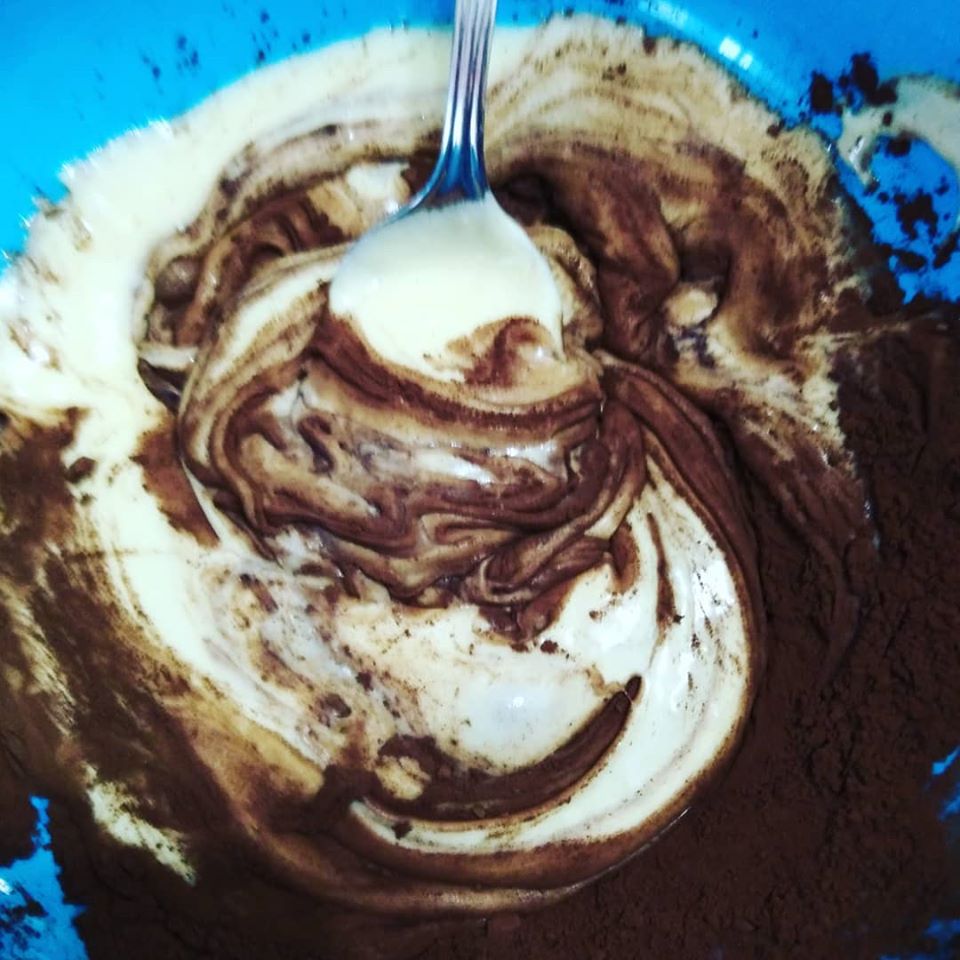 Dividetelo in due parti uguali, in cui in uno mescolerete il cacao in polvere per creare, la parte a cioccolato.