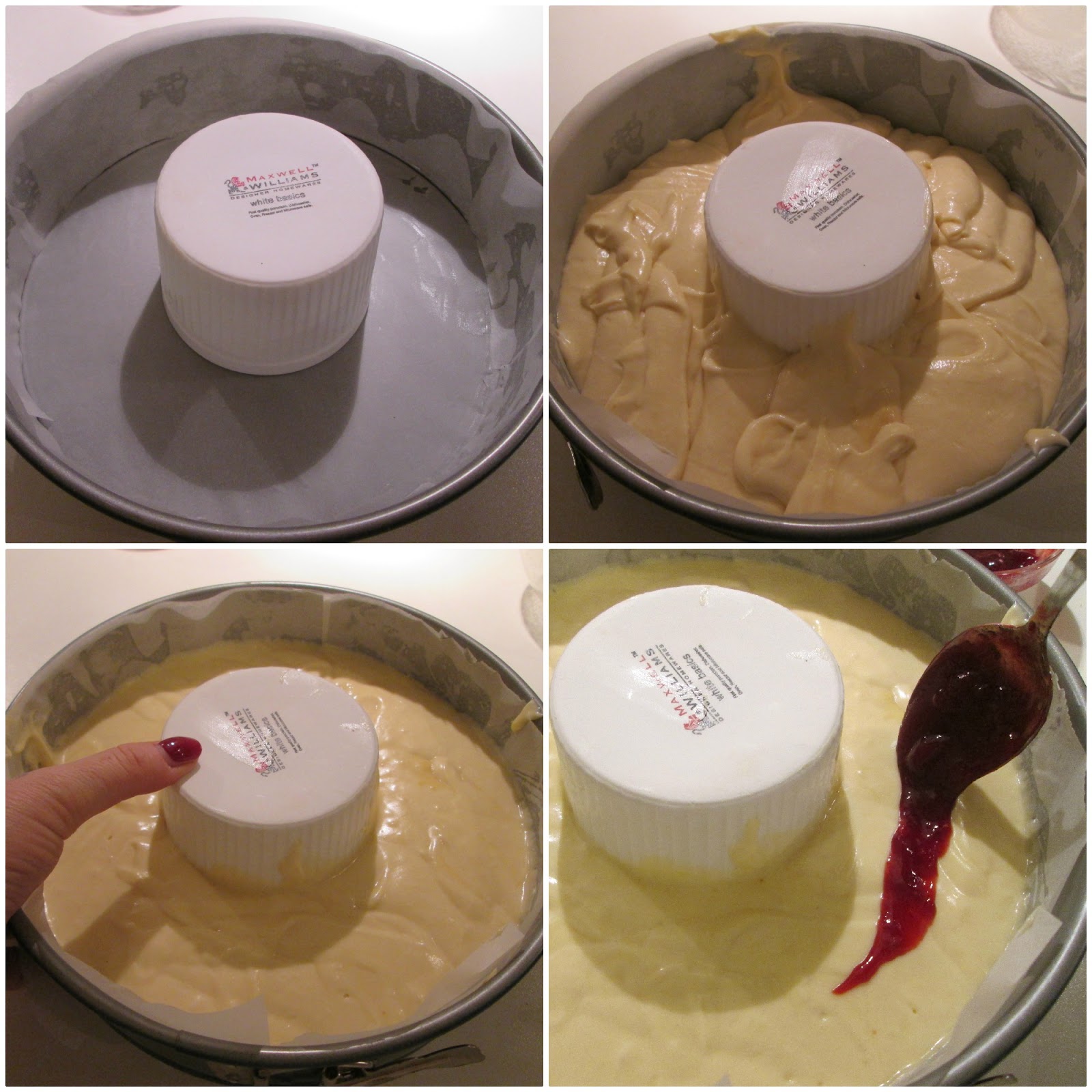 - Rivestite con carta da forno uno stampo da ciambella (se non l’avete inserite nel centro una tazza o ciotola da forno o un taglia pasta tondo, imburrato e infarinato!) e versate all’interno l’impasto cercando di livellare il composto dando qualche colpetto alla tortiera