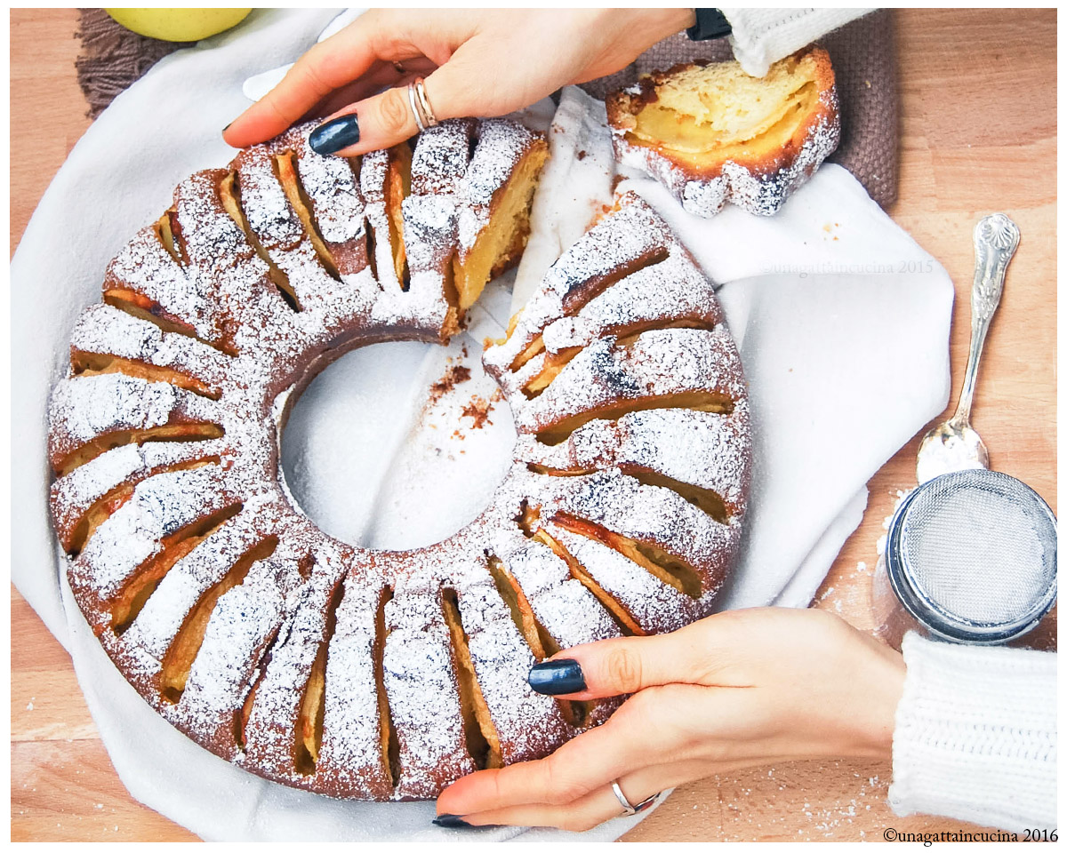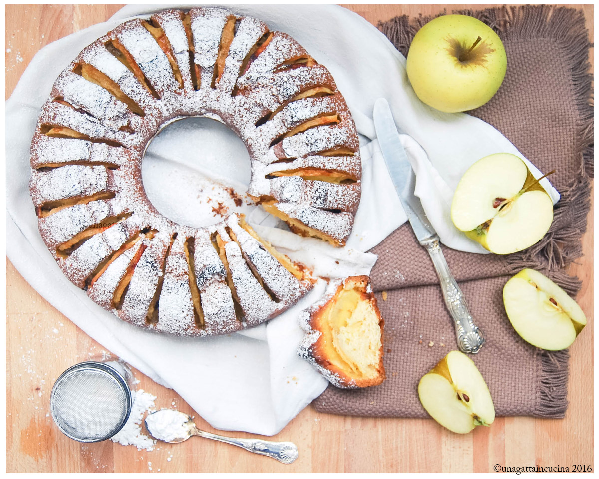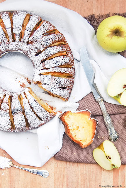 Grease and flour a bundt mold and arrange in the mixture ( it must be compact ), sunk well the apple slices in a radial pattern ( or as you wish ).