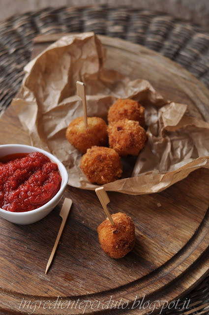Friggere le polpette in abbondante olio, scolare e servire subito accompagnandole con la salsa al pomodoro.