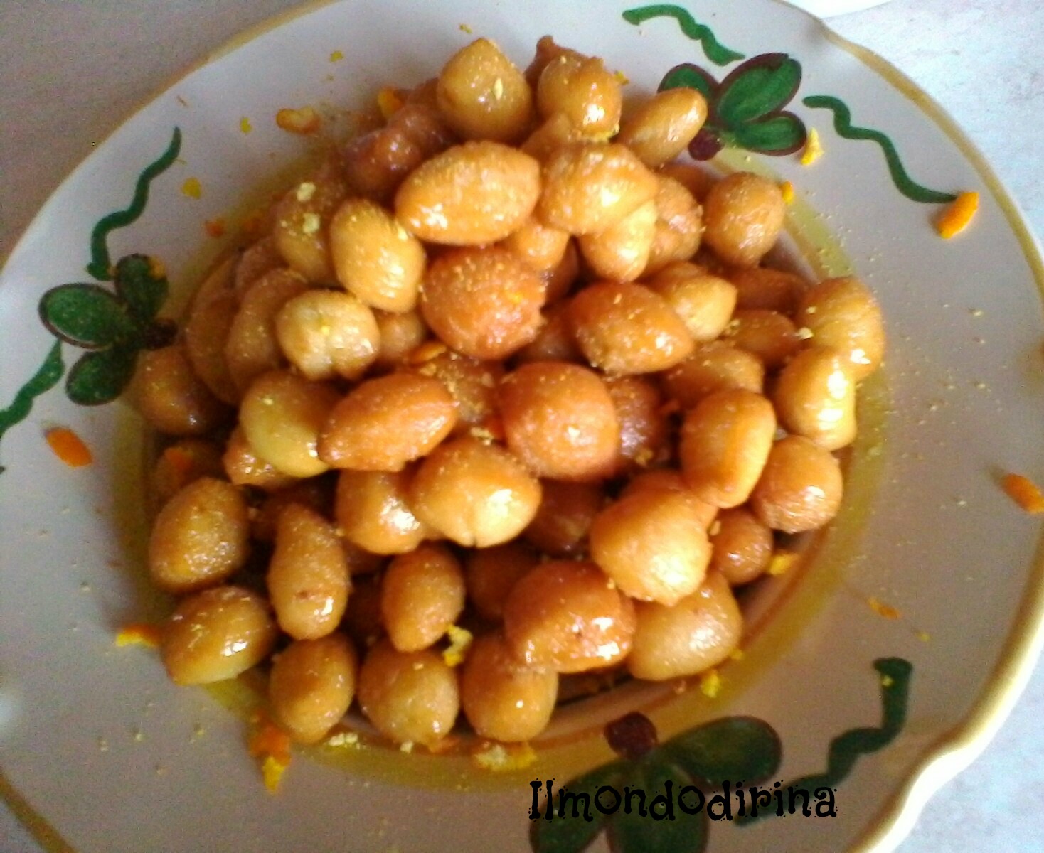 Mettete una padella con l’olio sul fuoco e, quando sarà caldo, friggete i dadini di pasta un pò per volta. Scolateli e fateli asciugare su carta assorbente. Sciogliete intanto in un tegame il miele e, prima che prenda bollore, tuffateci le palline e mescolate molto delicatamente in modo che si possano ricoprire di miele. Spegnete il fuoco e versate la pignolata formando la classica piramide. Abbellite la pignolata con i confettini colorati o con frutta candita. Io ho preferito della buccia d’arancia. Più profumata.