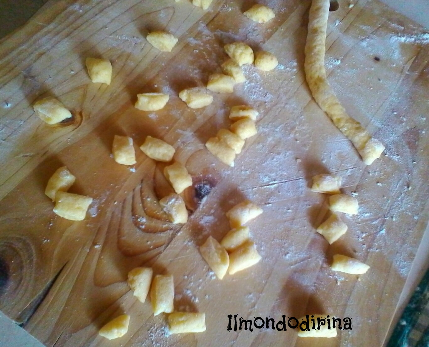A questo punto prendete un pò di impasto e, su un tagliere, formate dei bastoncini della grandezza di un dito che taglierete a dadini.