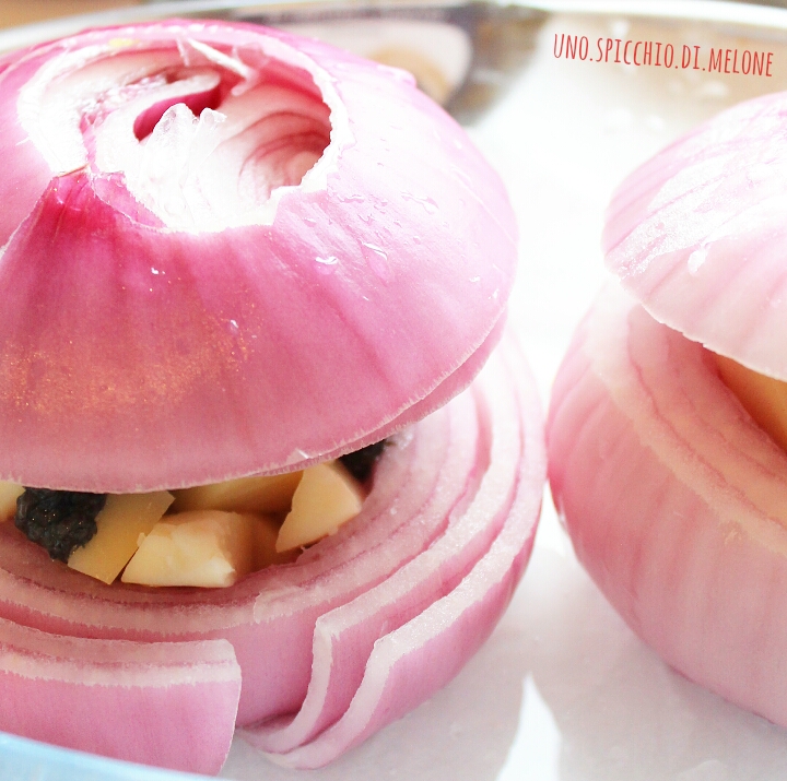 Iniziate a scaldare il forno a 200-220°C; sistemate DUE META’ di cipolla in una pirofila (rivestita da carta da forno) e riempitele di formaggio (che avrete tagliato a cubetti) e la crema al tartufo.