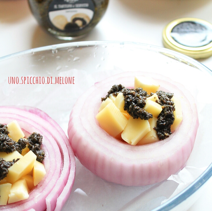 Iniziate a scaldare il forno a 200-220°C; sistemate DUE META’ di cipolla in una pirofila (rivestita da carta da forno) e riempitele di formaggio (che avrete tagliato a cubetti) e la crema al tartufo.