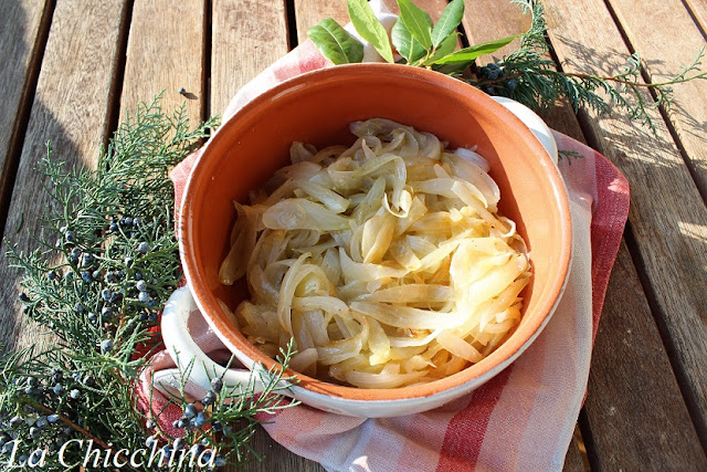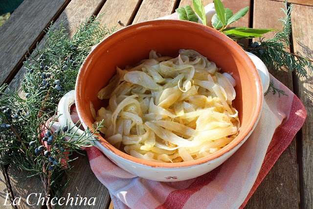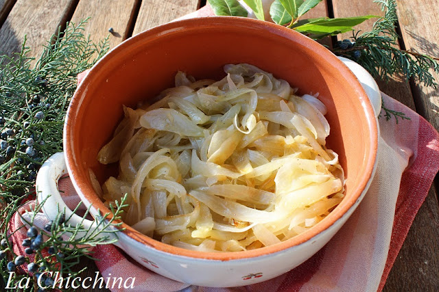 Si tratta di una preparazione semplice e relativamente veloce: cipolle affettate sottilmente e ripassate con olio, aceto, sale, pepe, zucchero, alloro e rosmarino.