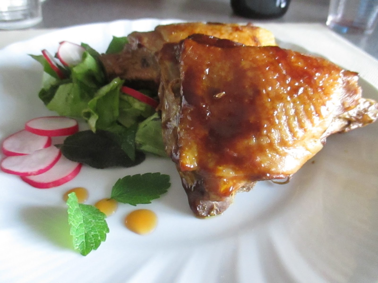 A very flavorful recipe and for nothing complicated to perform. many strong flavors but excellent if served with a fresh salad for degreasing. Perceptions aroma (dark beer), spicy (radish), sweet (honey), freshness (salad and mint).