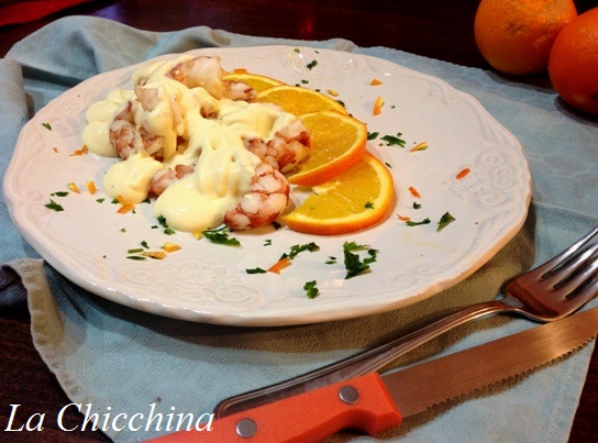 Questa è una ricetta apparentemente un po’ bislacca, ma vi garantisco che è deliziosa, oltre che sfiziosissima: si tratta di code di gamberone cotte in un brodo ricco e profumato accompagnate da una maionese particolarissima arricchita con succo d’arancia e appena un goccio di prosecco.