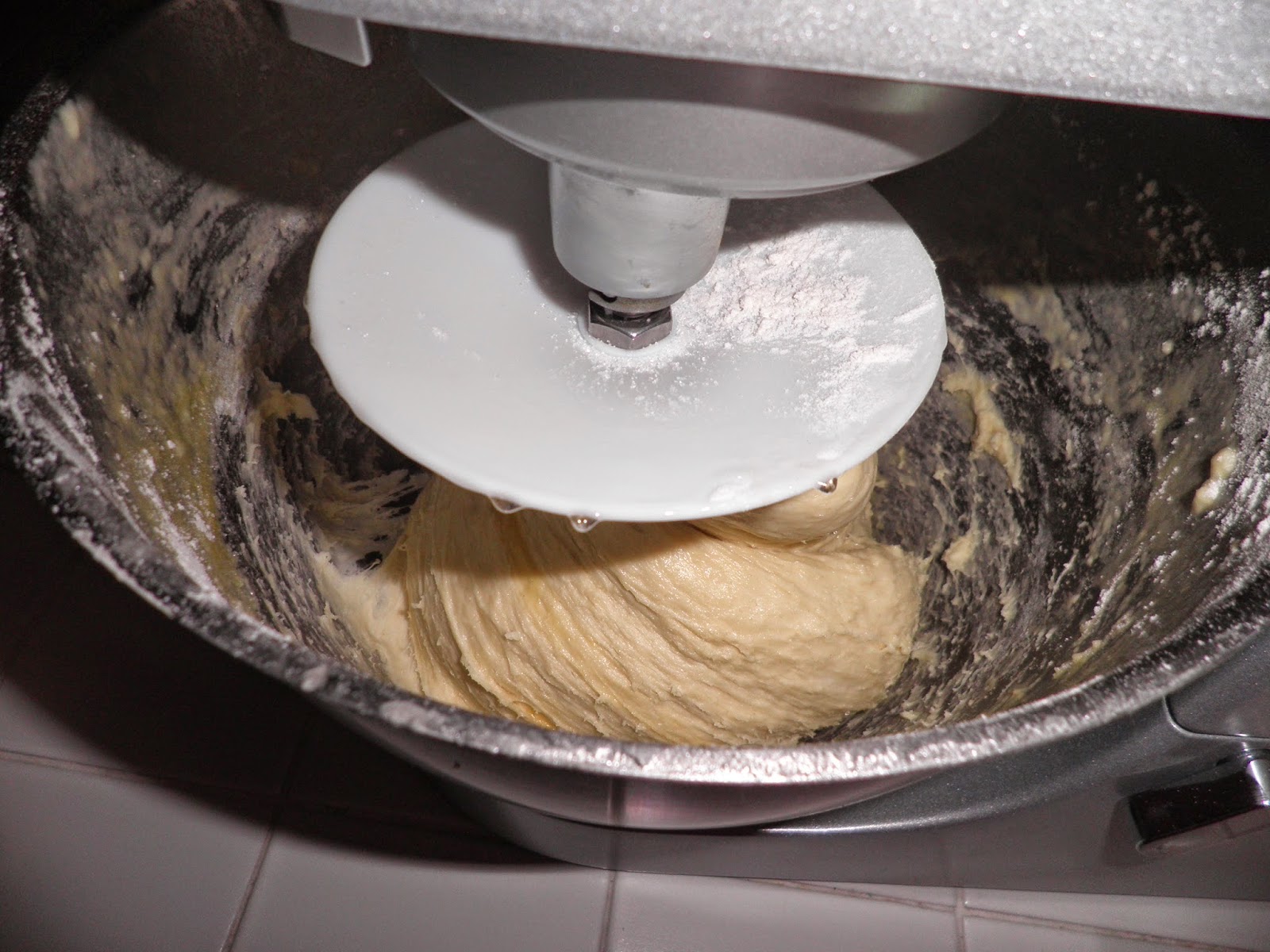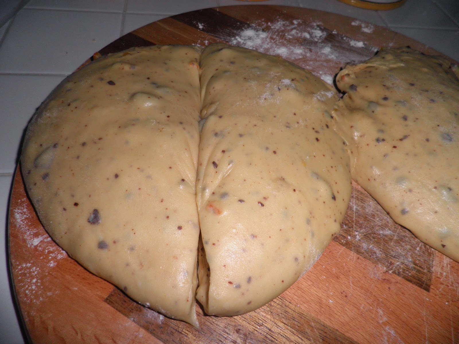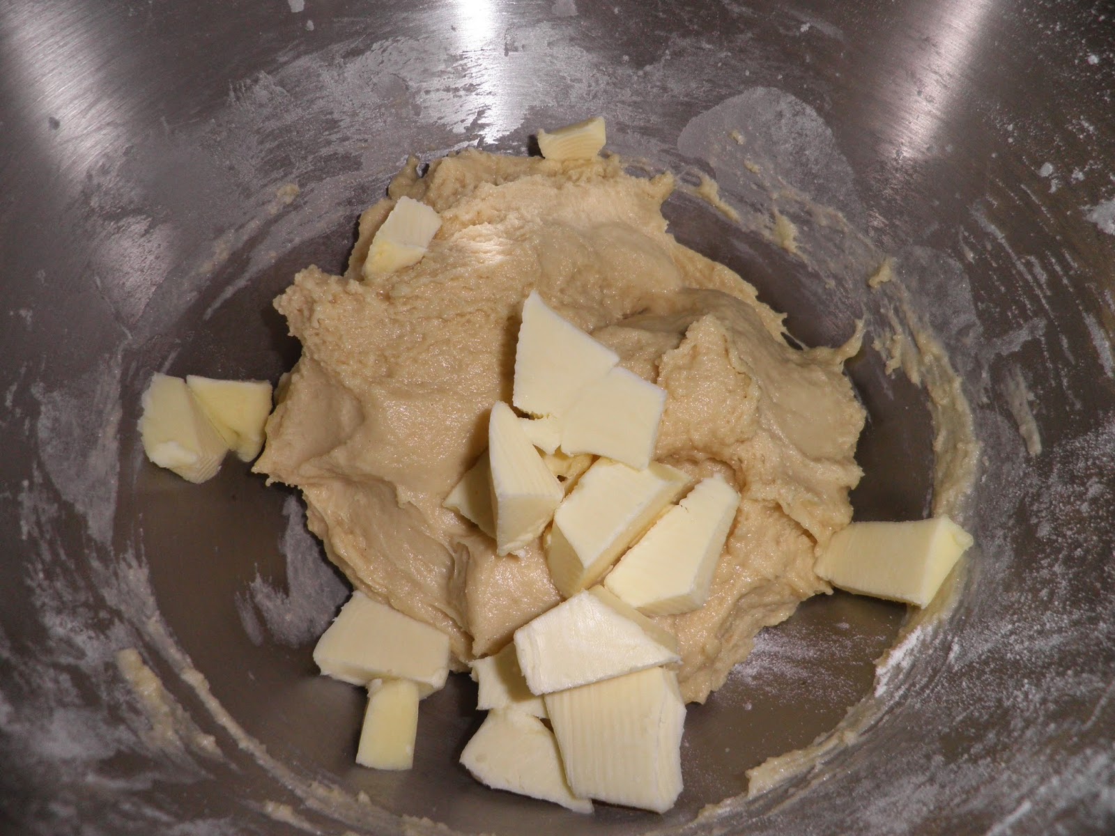 Bisogna cominciare il giorno prima facendo il primo impasto. Nella planetaria sciogliete 110 g di lievito madre ( io me lo ritrovo grazie a Stefano che lo ha fatto “nascere” per il mio divertimento in cucina) con 145 g di acqua leggermente tiepida e un cucchiaio di zucchero; pesiamo 355 g di farina manitoba, 80 g di zucchero, 90 g di burro; uniamo al lievito sciolto 1 uovo intero e un po’ di farina per far partire l’impasto. Alternando zucchero, farina e tre tuorli, uno alla volta, procedete ad impastare. Aggiungete il burro non sciolto, piano piano e impastate fino a quando la massa non diventerà lucida.