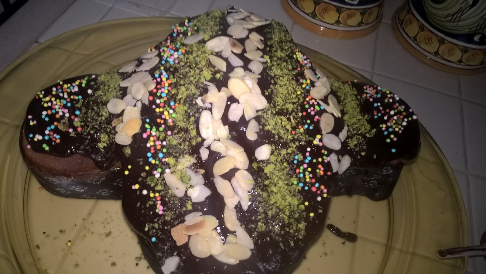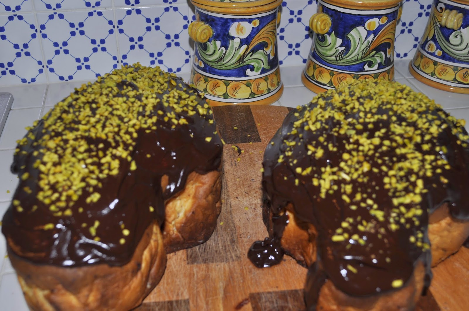 Fate sciogliere 200 g di cioccolato fondente con 80 ml di panna e ricoprite le colombe; decorate con granella di pistacchio, con mandorle tostate, con qualunque cosa vi piaccia. Vi mostro alcune mie versioni.