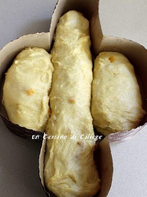 Prendere la prima parte d’impasto e disporlo al centro dello stampo a colomba da un kg, dividere la seconda parte d’impasto per formare le ali.