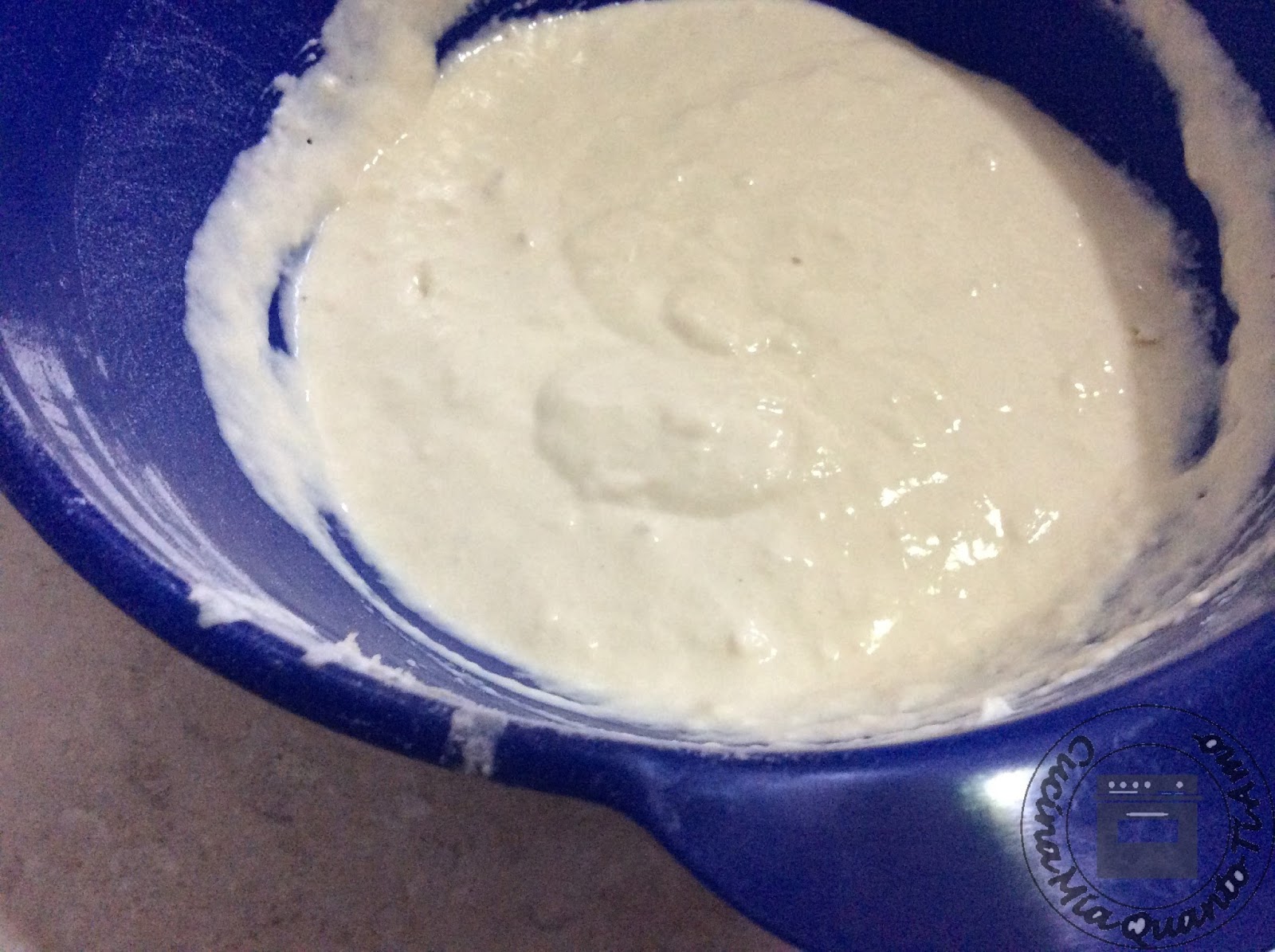 Sciogliete il lievito nel latte tiepido, aggiungete la farina e mescolate velocemente con una spatola.