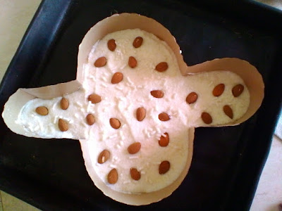 Preparate adesso la glassa: sbattete gli albumi e pian piano aggiungete lo zucchero e la farina di mandorle. Quando avrete ottenuto un composto denso che non cola, ricoprite la colomba e cospargetela con le mandorle intere e la granella di zucchero.