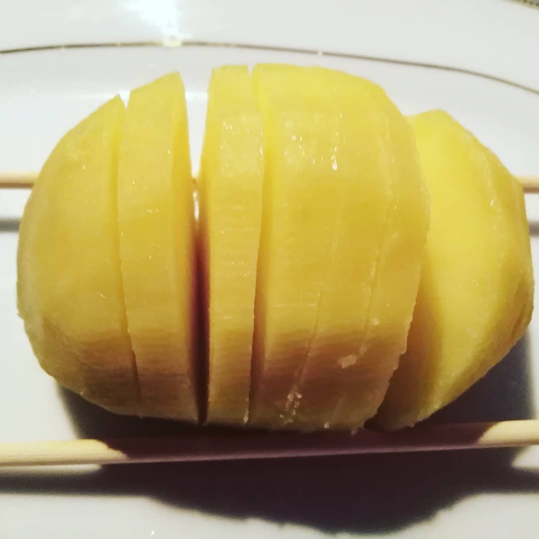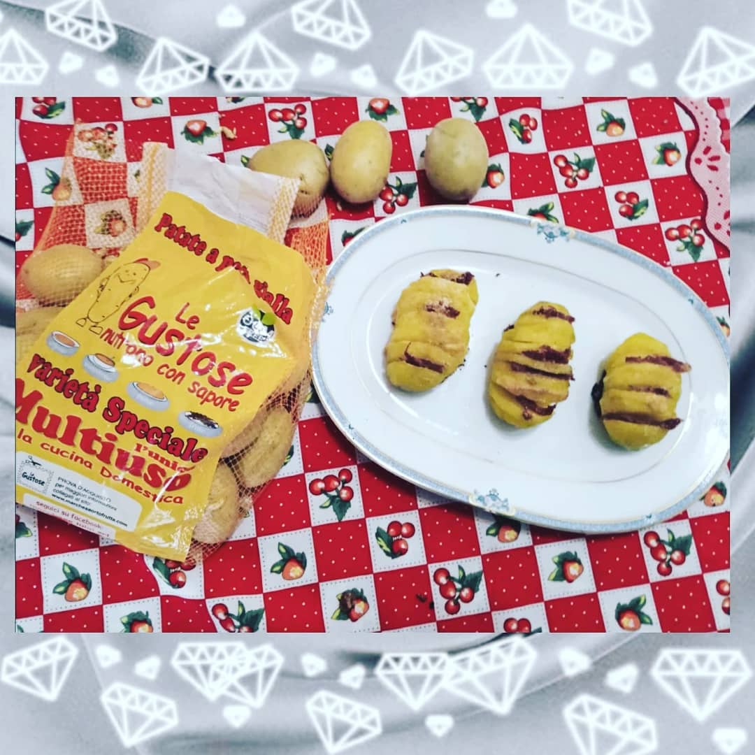 Farcite con formaggio e #salumi. Semplici da preparare: sbucciate e lavate le patate, tagliatele a fette e fate attenzione che il taglio non arrivi fino a sotto. Inserite, come vedete dalle foto, in modo alternato, una fetta di formaggio e una di salame. Mettete in forno condite con olio di oliva, sale ed origano. Cuocete fino a renderle dorate e buon appetito.