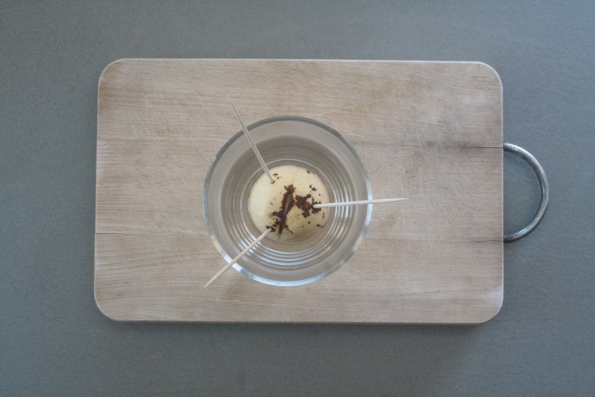 Successivamente prendete 3 stuzzicadenti e infilzateli (ma non superate i 5 mm di profondità) ai lati del seme in modo che fungano da supporto quando poi si procede ad immergere il seme in un bicchiere di vetro trasparente. Assicuratevi che la parte più appuntita – dalla quale crescerà il germoglio – sia rivolta verso l’alto e quella più arrotondata e piatta – da dove usciranno le radici – verso il basso (è importante non posizionare il seme al contrario altrimenti non nascerà la pianta).