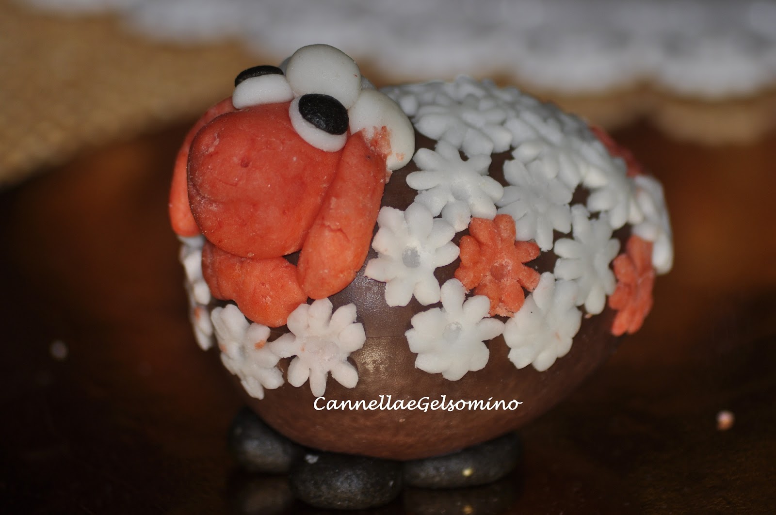 I fiorellini sono stati realizzati con gli stampini ad esplulsione, mentre le palline, la testa e le orecchie modellate a mano. Sotto l’ovetto posizionate 4 palline per simulare le zampette.