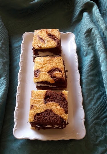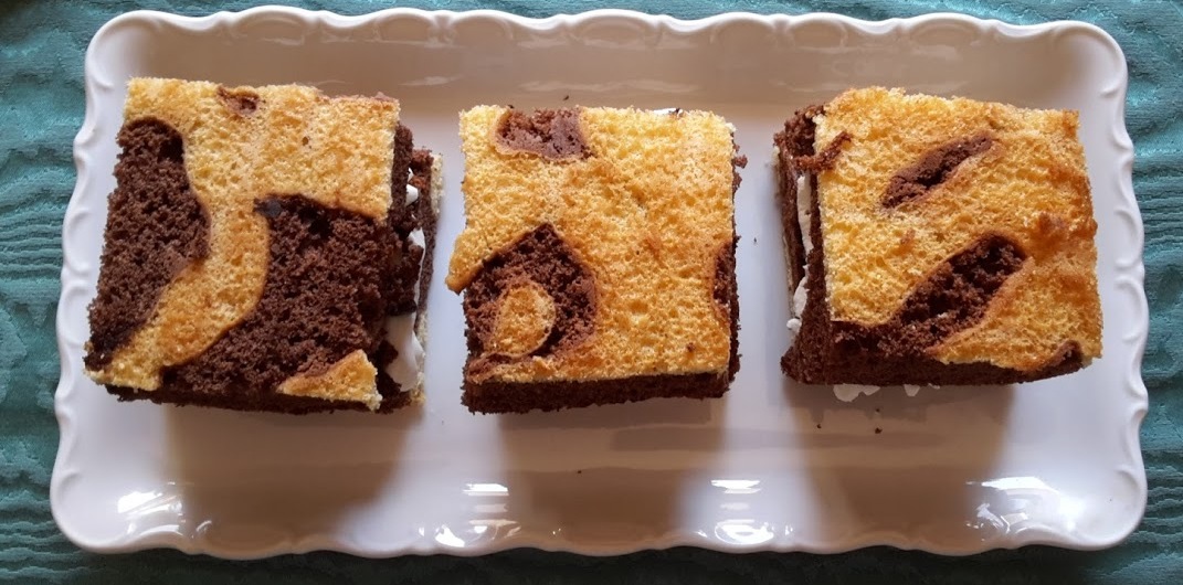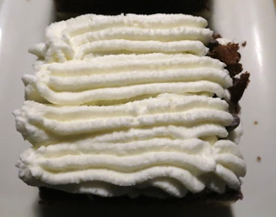 Alla fine, dopo averci pensato un poco mi sono decisa di utilizzare quanto avevo ottenuto tagliando la base in quadrati regolari e farcendoli con panna montata e gocce di cioccolato..