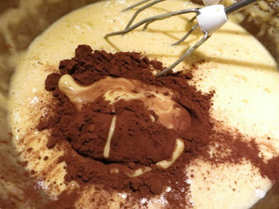 Aggiungere all’impasto bianco il cacao e mescolare per bene..