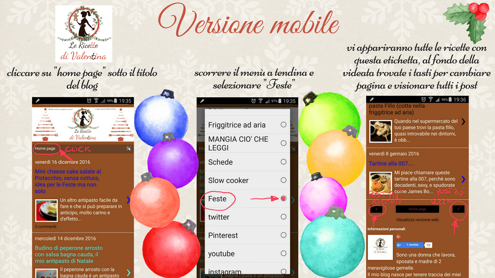 Purtroppo la versione mobile di blogger non permette molte persoanlizzazioni da parte mia, quindi ho pensato dimettervi un piccolo schemino per aiutarvi a cercare tutte le mie ricette passate e future delle Feste e non solo.