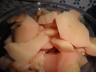 Le sbuccio, tolgo il torsolo e le taglio a pezzi.