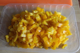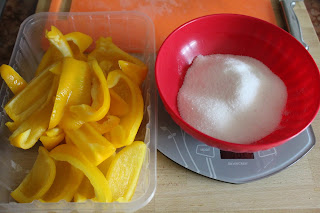 tagliare i peperoni a cubetti, versarli in una ciotola capiente e mescolarli con 250 gr dello zucchero previsto in ricetta.
