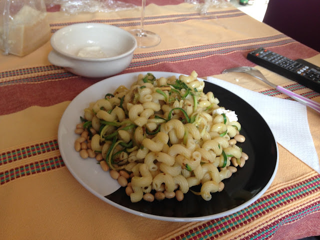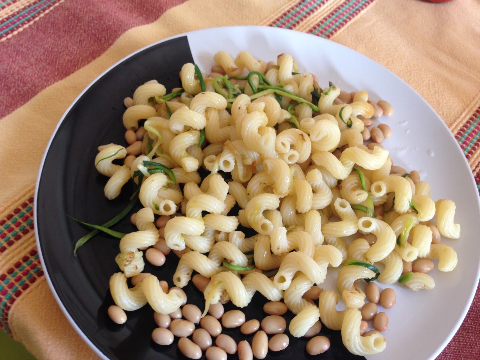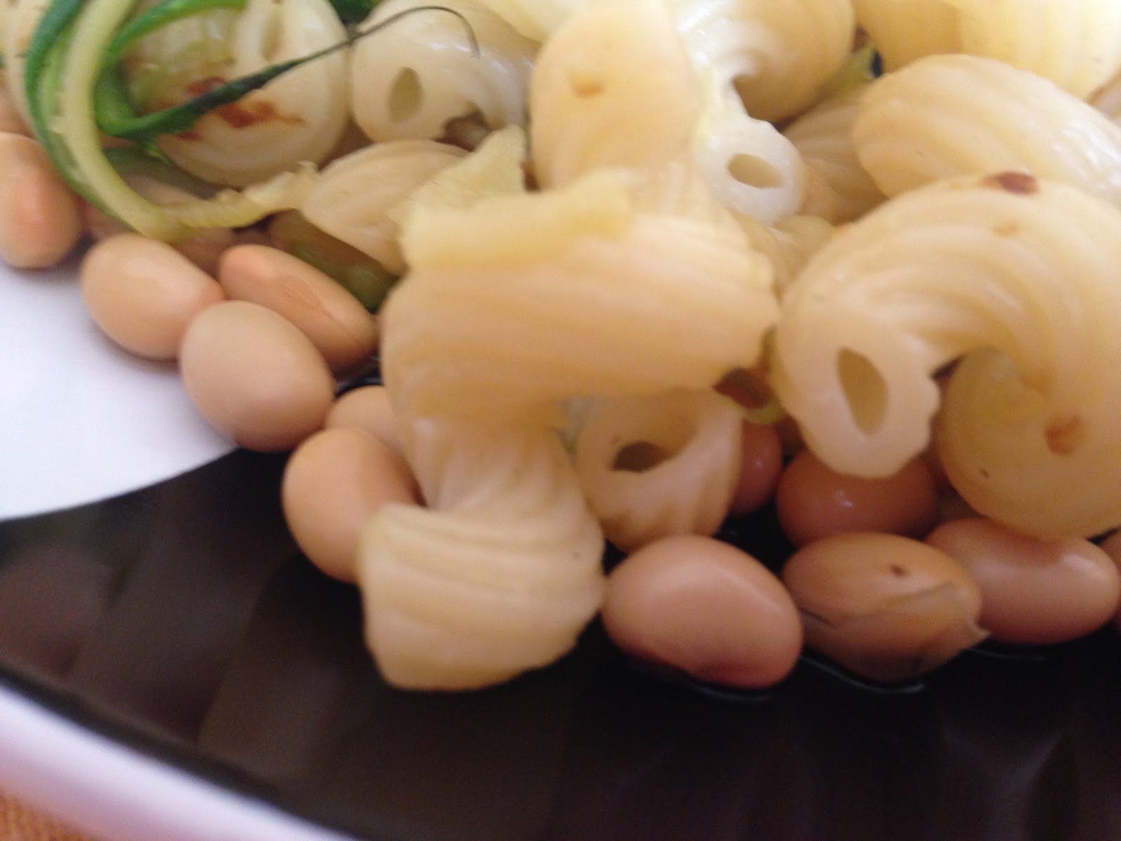 Cavatappi al Kamut, 2 zucchine julienne, un po’ di stracchino, fagioli di soia, poco olio di oliva, sale q. b., grana o parmigiano a piacere, Shoyu.