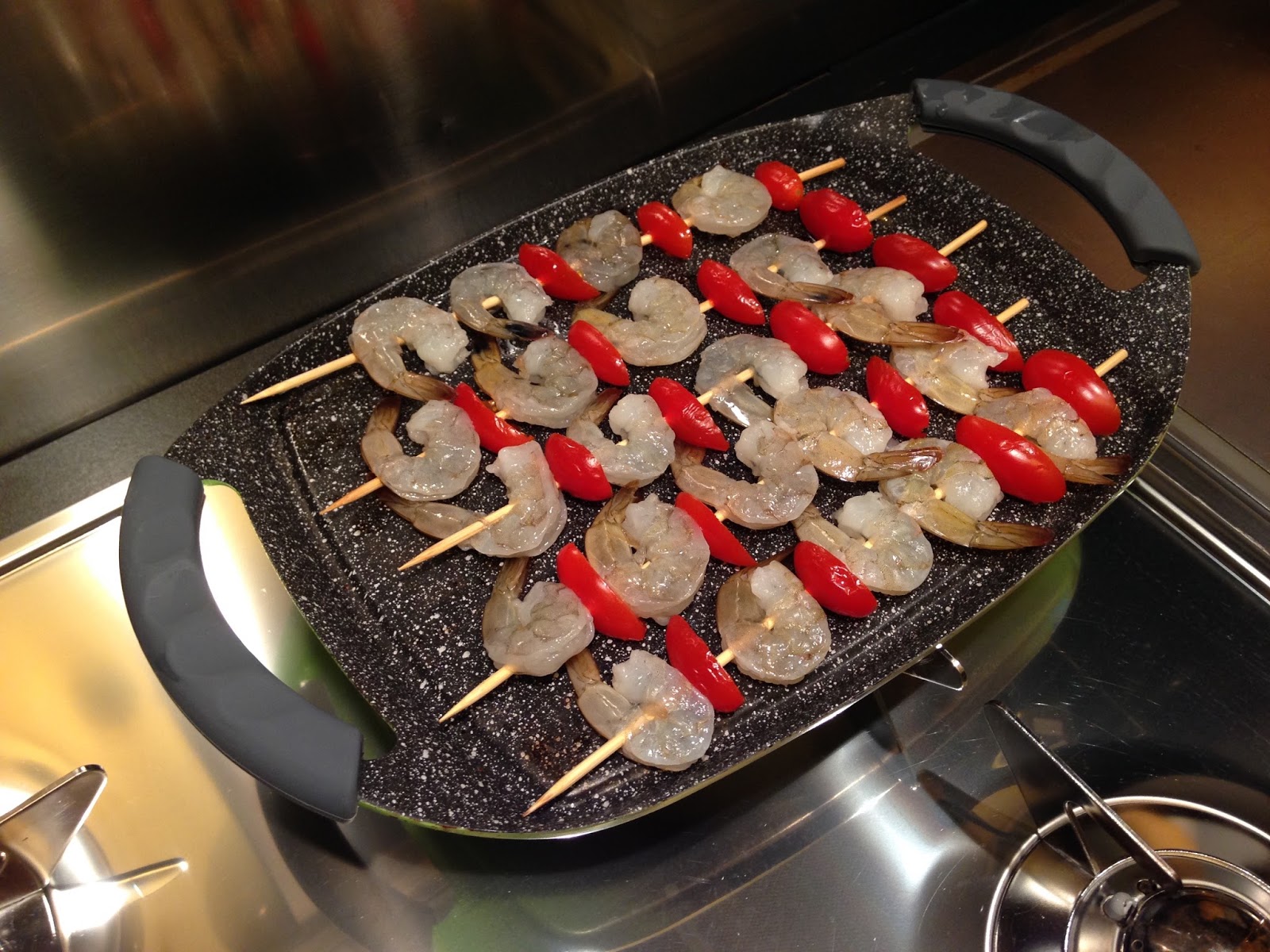 Cuocete la quinoa dopo averla ben lavata per il tempo scritto sulla confezione, 20 minuti circa. Metteteci un po’ di olio e Shoyu sopra. Pulite e togliete il guscio ai gamberi e l’intestino, lasciando solo la cosa. Formate gli spiedini con i pomodorini ed i gamberi. Cuocete gli spiedini di gamberi e pomodorini con un po’ di miele sopra. Mettete in piatto sopra alla quinoa rossa, nera e bianca.
