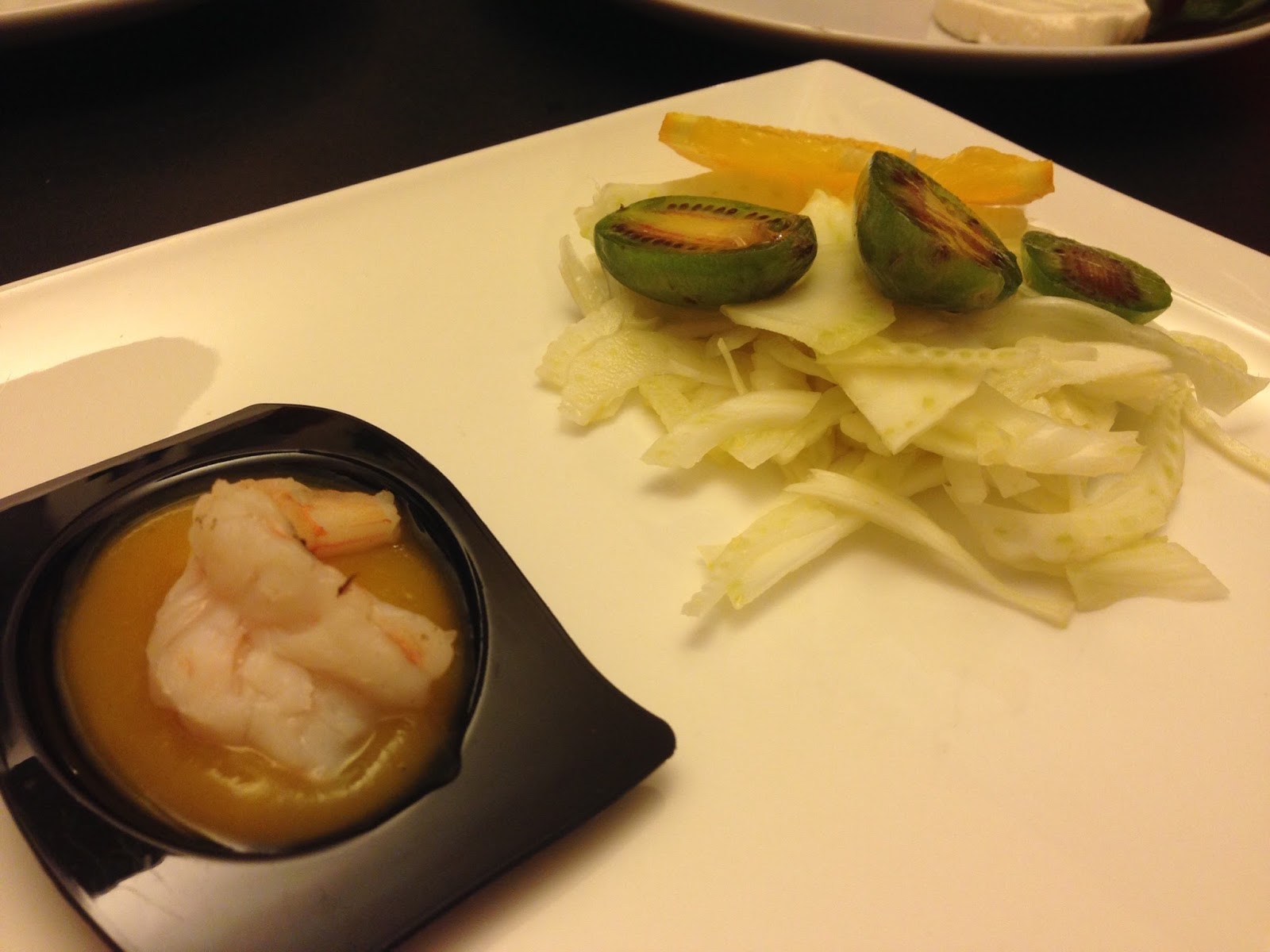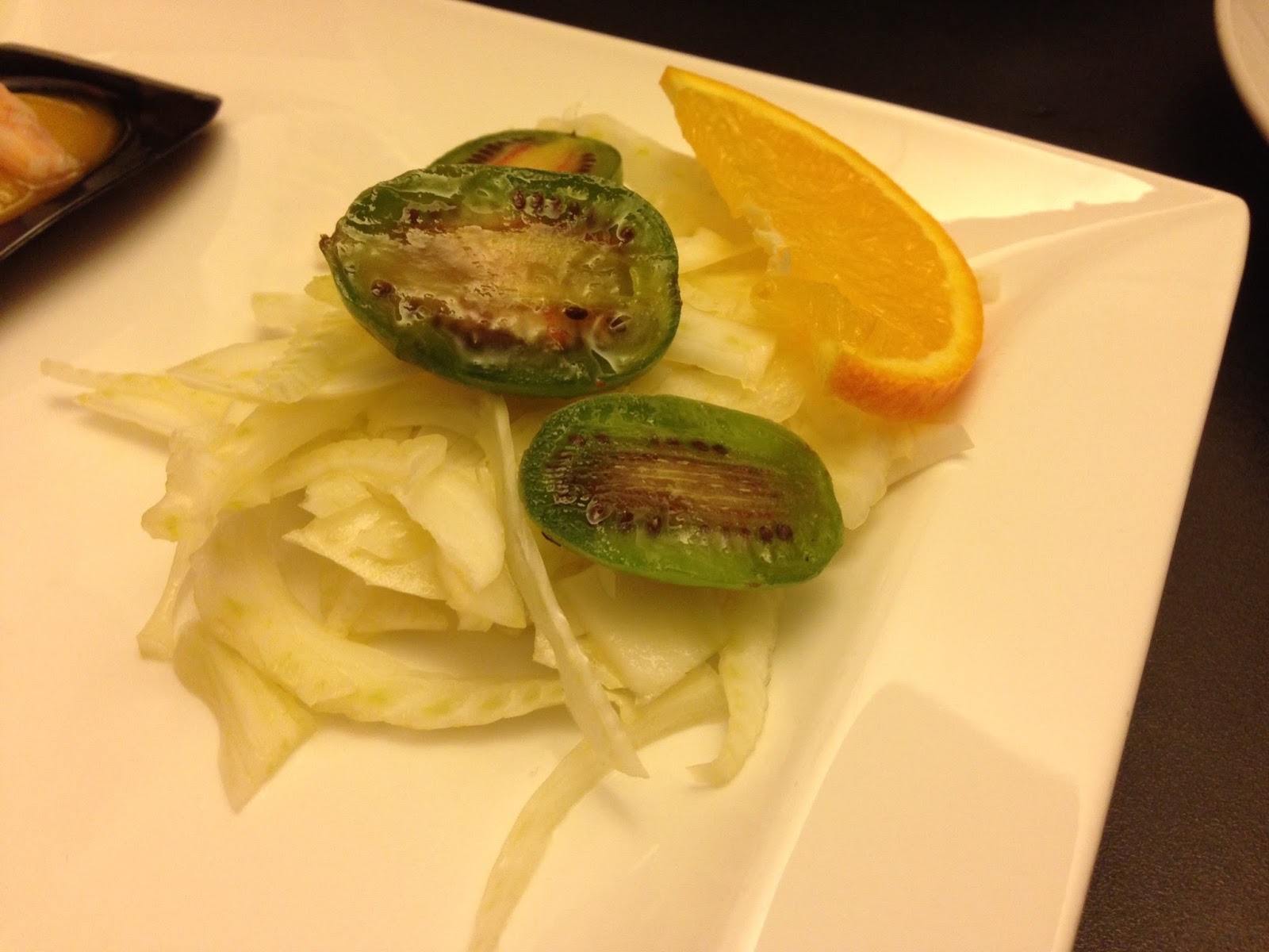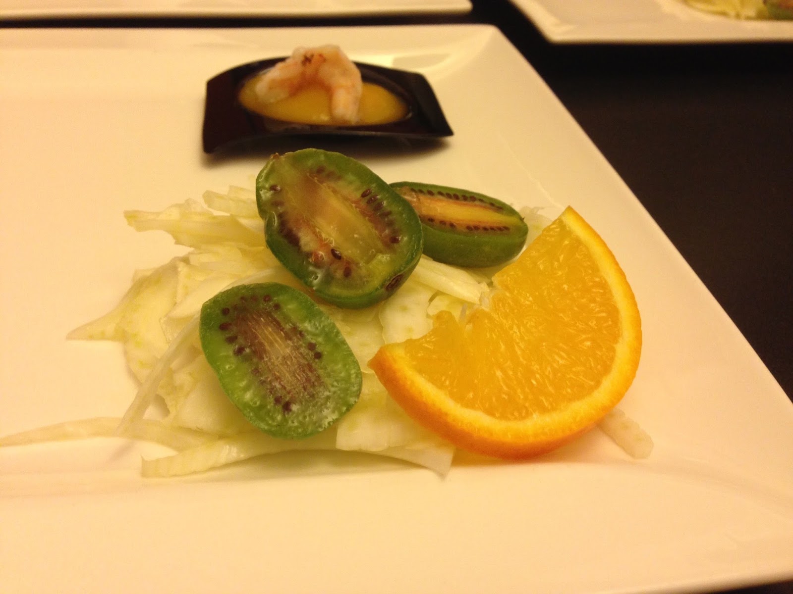 Lava il finocchio, puliscilo, taglialo con la mandolina fino fino. Metti in piatto. Mettici sopra il succo di mezza arancia spremuta e l’altra metà tagliala a fettine e mettile sopra i finocchi. Metti sopra i Nergi.